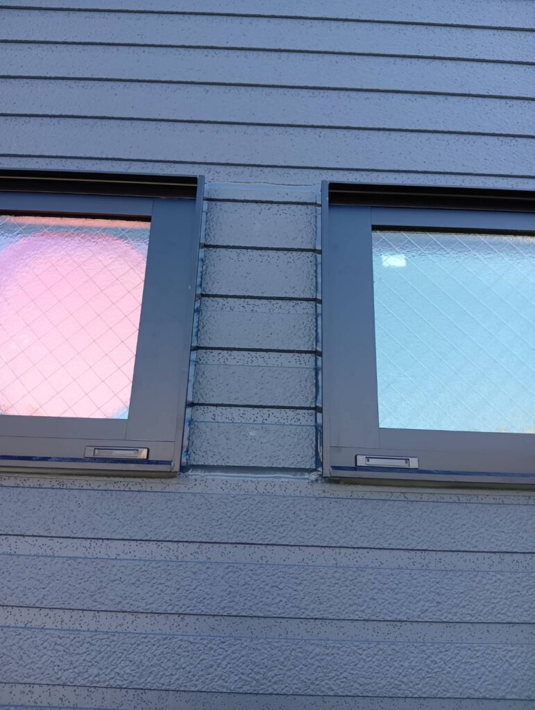 復旧工事は、サッシ間のサイディングを剥がし上下コーキングをして負荷を緩和しました。